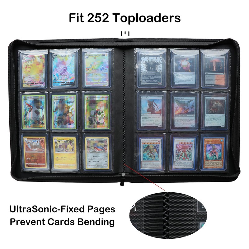 - Premium Build: Holds 252 Toploaders with 14 double-sided 9-pocket pages bound to the spine, built without rings. No more worrying about rings damaging your collectibles.