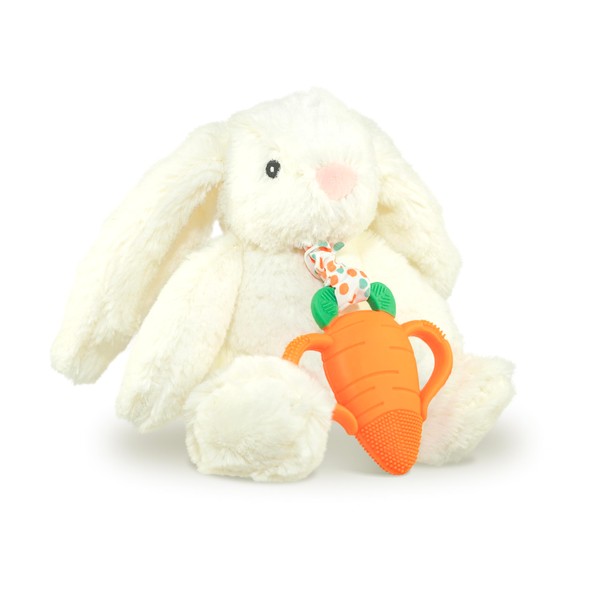 RaZbaby Bunny Snuggly w/Carrot Teething Relief Toy – Soothes Sore Gums w/Nature-Inspired Texture, 100% BPA-Free Silicone Teether, Soft Minky Stuffed Animal – All Ages