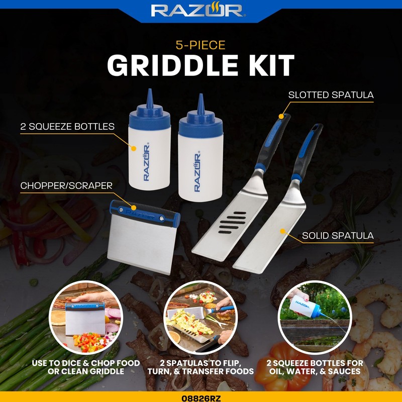 Razor 5 Piece Griddle Kit Tool Set- Includes Steel Chopper, 2 Clear Squeeze Bottles, and 2 Spatulas