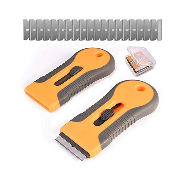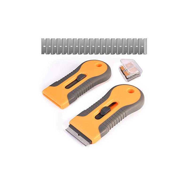 - [Package Content] - Our single-sided razor blade holder scraper set includes 2 pcs window scraper with razor blade and 40 pcs additional metal scraper razor blades are provided for easy replacement. The razor blade scraper for glass can work for hard and soft surface without scratches, meet your various needs