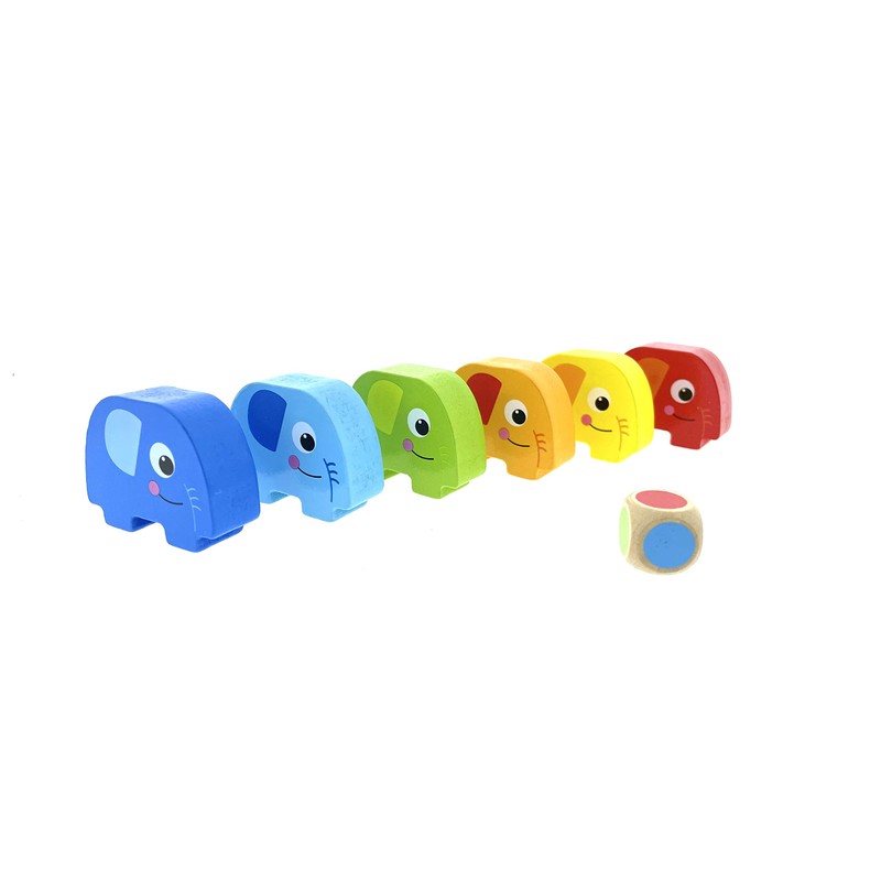 - Box contents: 46-piece play set, with 36 elephants in a variety of colours, floor boards and a dice.
