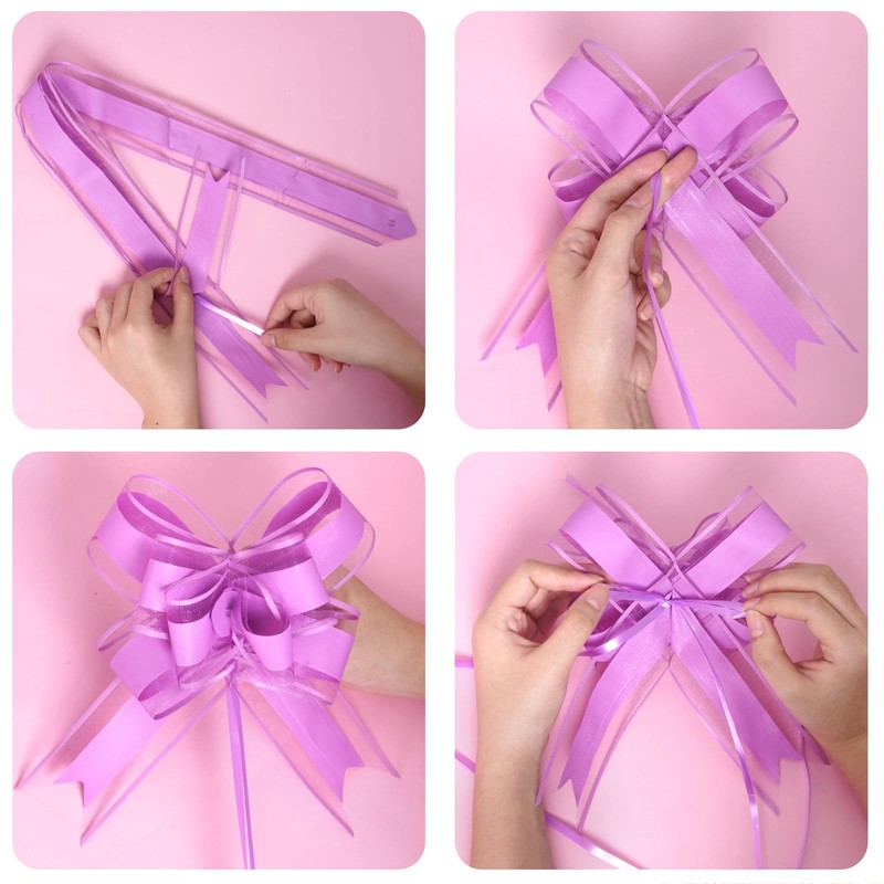 - Easy to Use:The gift wrap ribbon pull bows are easy to assemble and can be formed in just a few seconds. Just clip two thin ribbons in the middle and pull open the two wide ribbons to form a beautiful finished bow.