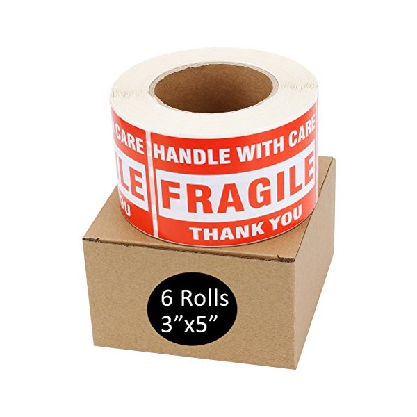 RBHK 3" X 5" Fragile Handle with Care Warning Stickers for Shipping and Packing - 500 Permanent Adhesive Labels Per Roll (6 Rolls)