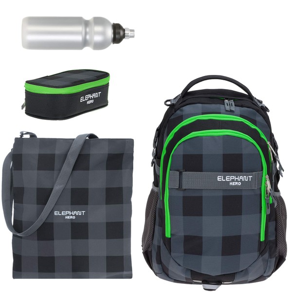 RBMF Elephant Hero Signature School Backpack + Pencil Case + Bag + Bottle Set of 4, Plaid Green 4 Pieces Rbmbf, School backpack