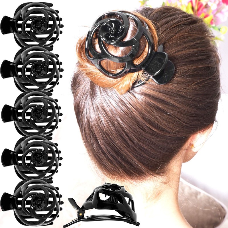 - Size – 6 count value pack; 4 inches length x 3 inches width x 2.5 inches height (10.16 cm x 7.62 cm x 6.35 cm) Large stylish Black hair bun clips; plastic portable hair bun making tool fit in your purse bag; fashion hair clips