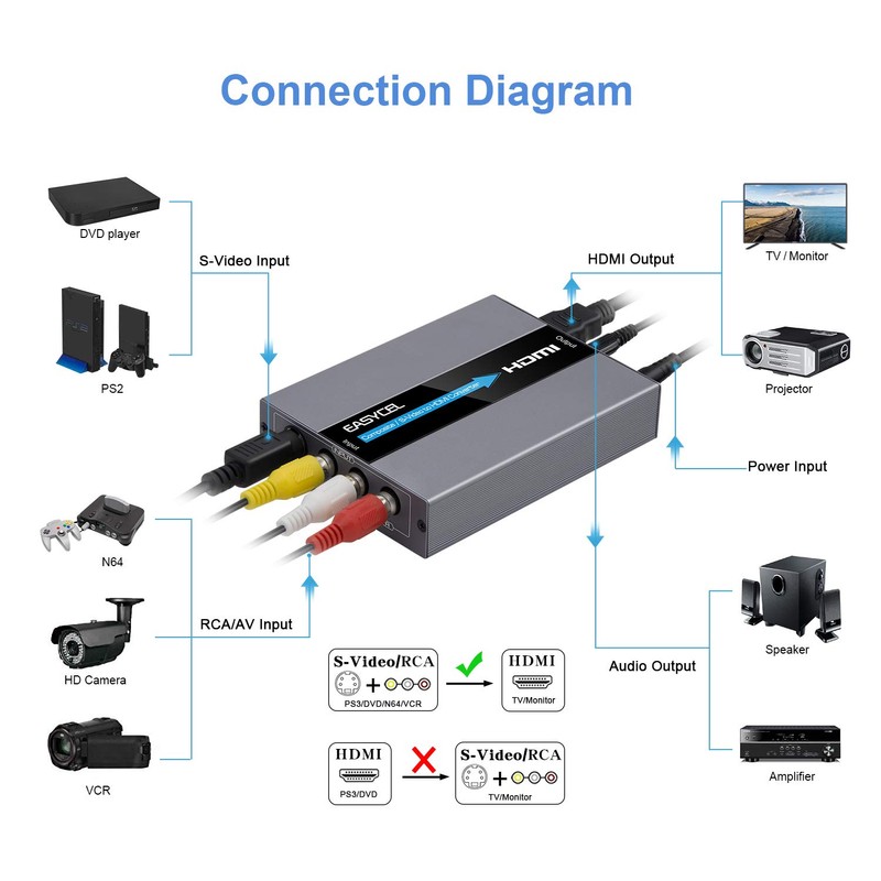 EASYCEL RCA S-video to HDMI converters converts RCA (AV, Composite, CVBS) or S-video signals into HDMI signals so you can watch your video on a modern TV with HDMI input ports.