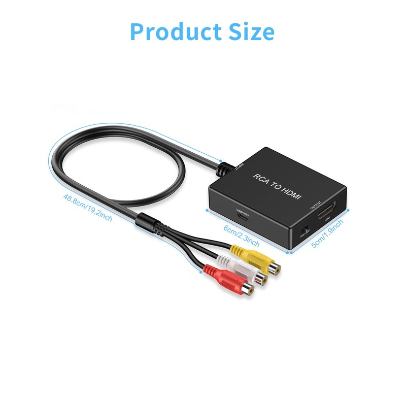 - Package include:1*RCA Female to HDMI Converter(with rca cable),1*HDMI cable,1*usb power cable(adapter not included),1*User Manual