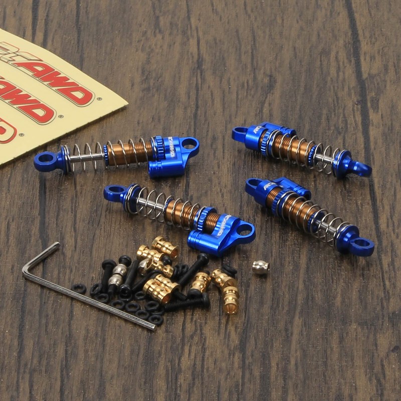 - đ„ăSpecă:The all-inclusive kit contains 4pcs alloy front and rear shock absorber;4pcs pan head hex screw 2*14mm; 4pcs pan head hex screw 2*10mm; 20pcs O-ring 4*1mm; 8pcs brass pivot ball 4*6.2*2.5mm; 4pcs silver pivot ball 4*4*2mm; 1 piece 1.5mm L wrench.