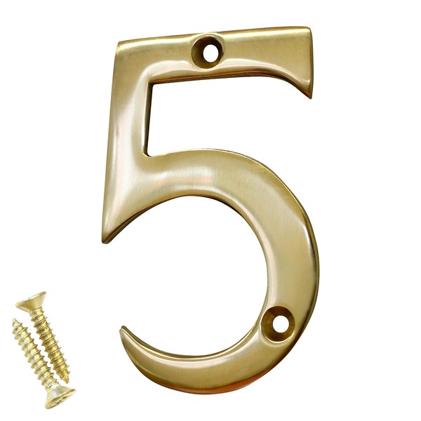 RCH Hardware 2275PB075 | Solid Brass 3" Tall House Number 5, Polished Brass Shiny Gold Matching Screws Included