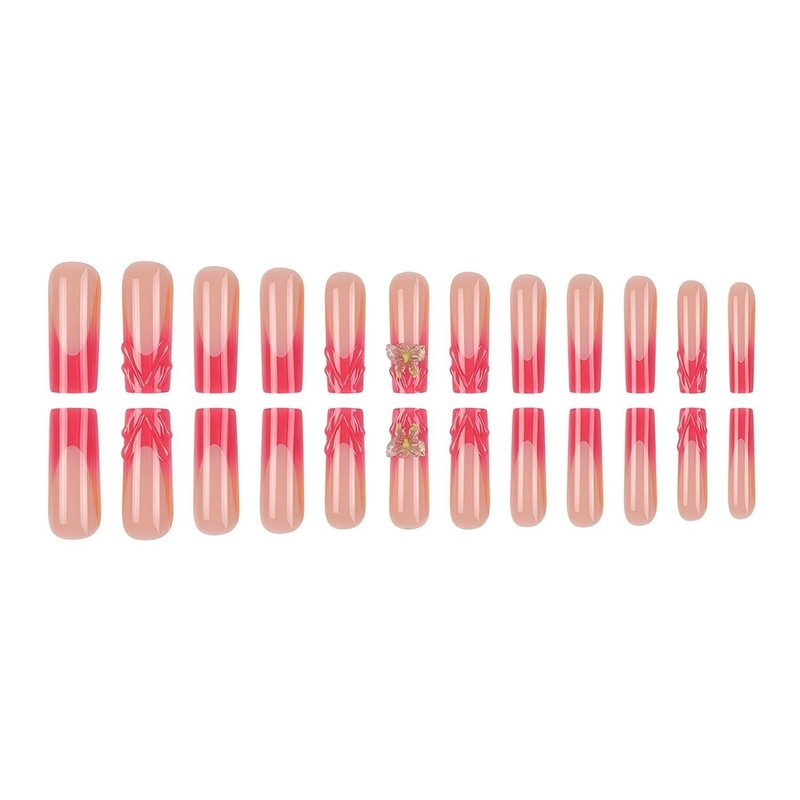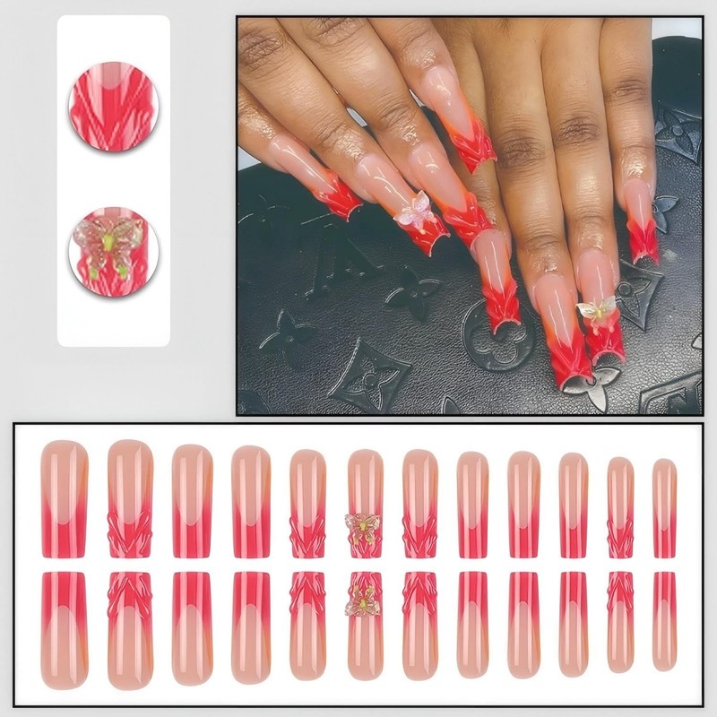 Rchovsam Long Square Press on Nails xl Red French Tip Fake Nails 3D Butterfly Designs Nails Press Ons 3D Stripe Stick on Nails Full Cover Artificial Nails Gift for Women 24pcs