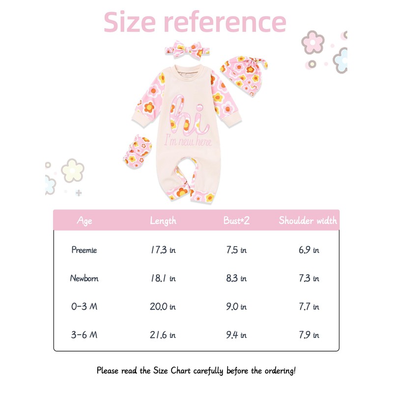 - Age:Please kindly refer to the size chart in the product description before you buy the item.The set is suitable for ages preemie infant girl jumpsuits ,born girl outfits, 0-3 month born girls romper outfits,3-6months baby girl clothes, Cute baby girl clothes romper/ outfits set for seasons.