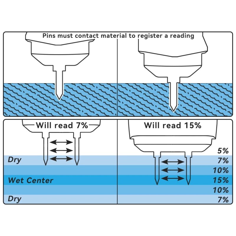 Accurate Deep Moisture Measurement: For the most reliable readings, insert the pins deeply into the material (whether wood, hardwood, or building materials). The pins measure moisture along their entire length, allowing for precise readings—even when the surface is dry, but the interior is still moist
