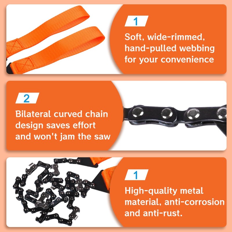 • Outdoor survival: In an emergency, if no electric chainsaw is available, this is a very good alternative. No special skills or experience are required to handle a chainsaw. Everyone can use it without any problems. Hand chainsaw is a great addition to your survival gear.