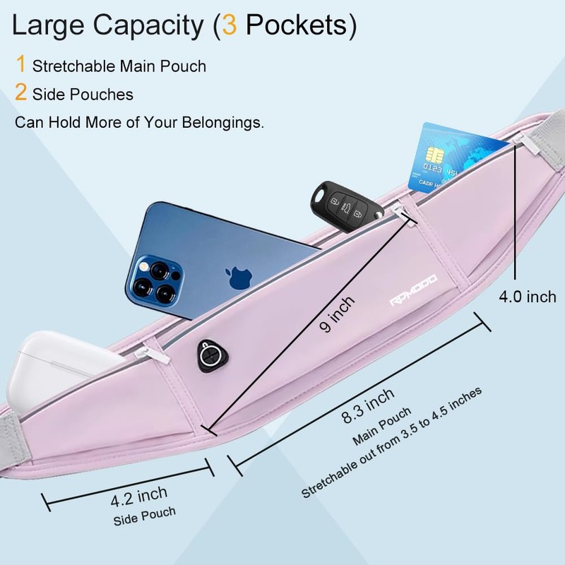 - 【Large Capacity】The waist bag for men has 3 pockets. The main pouch stretches from 3.5 to 4.5 x 8.3in(HxL), which can hold phones or power bank under 7.5 inches. The 2 side pouches are 4.0 x 3.5in, for holding earphone, keys, cards, cash, tissues, watches, bracelets, etc. The running fanny pack women is lightweight so you almost cannot feel it when you put it on.