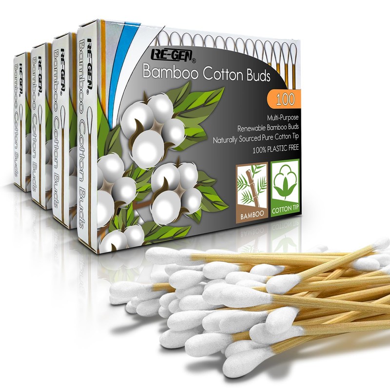 RE-GEN Bamboo Cotton Buds 400 Pack (4x 100pc Box) | 100% Natural Cotton Wool Tips | Biodegradable Compostable Bamboo Ear Buds | Eco-Friendly Recyclable Plastic Free