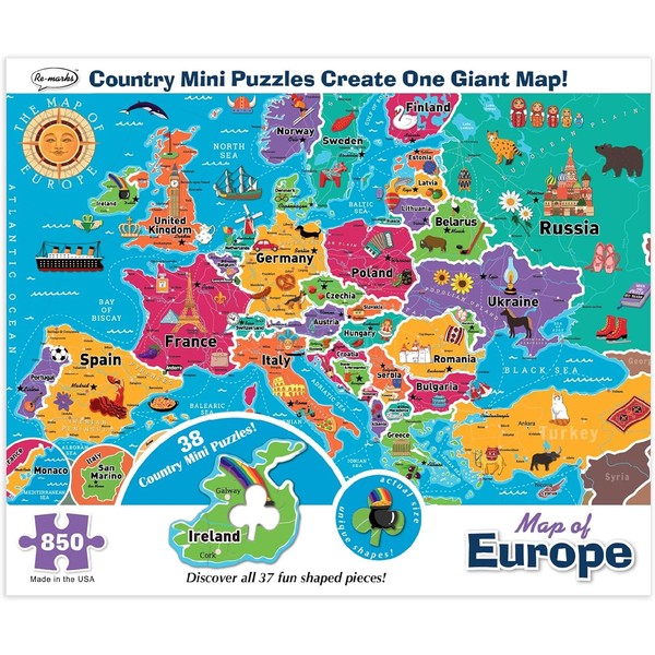 - EUROPEAN-MAP PUZZLE: This Europe puzzle features bright colors and 38 uniquely shaped pieces to make assembly fun. Each country has its own mini puzzle that connects to complete a giant map of Europe, making this puzzle fun and educational for all.