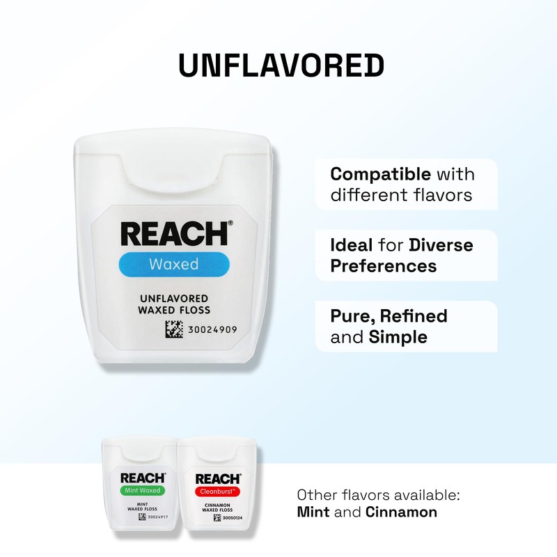 Clean between teeth and under your gum line with Reach Unflavored Waxed Dental Floss. This unflavored floss is designed to slide easily and comfortably between teeth while it removes plaque and food particles for optimal oral hygiene when used after brushing. It is accepted by the American Dental Association (ADA) and is designed to clean between teeth and under the gum line. Flossing is part of a dentist-recommended oral care routine that is designed to remove plaque and help reduce tooth decay.