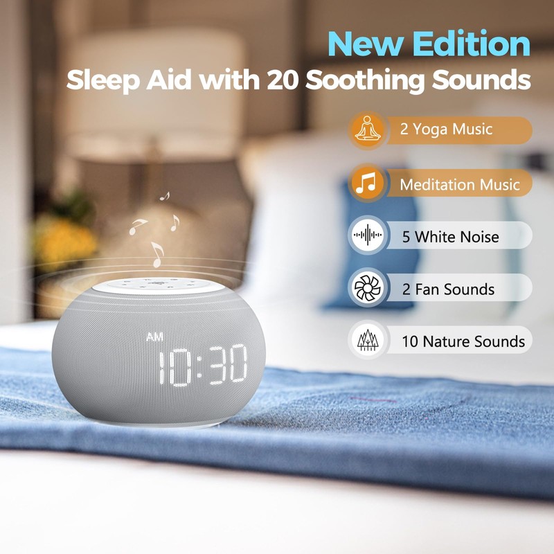 Reacher Auto-Dimmable Sound Machine Alarm Clock with Night Light, 20 Soothing Sounds, LED Digital Display, Sleep Timer, Precise Volume Control, White Noise Soother for Baby, Adults, Bedrooms