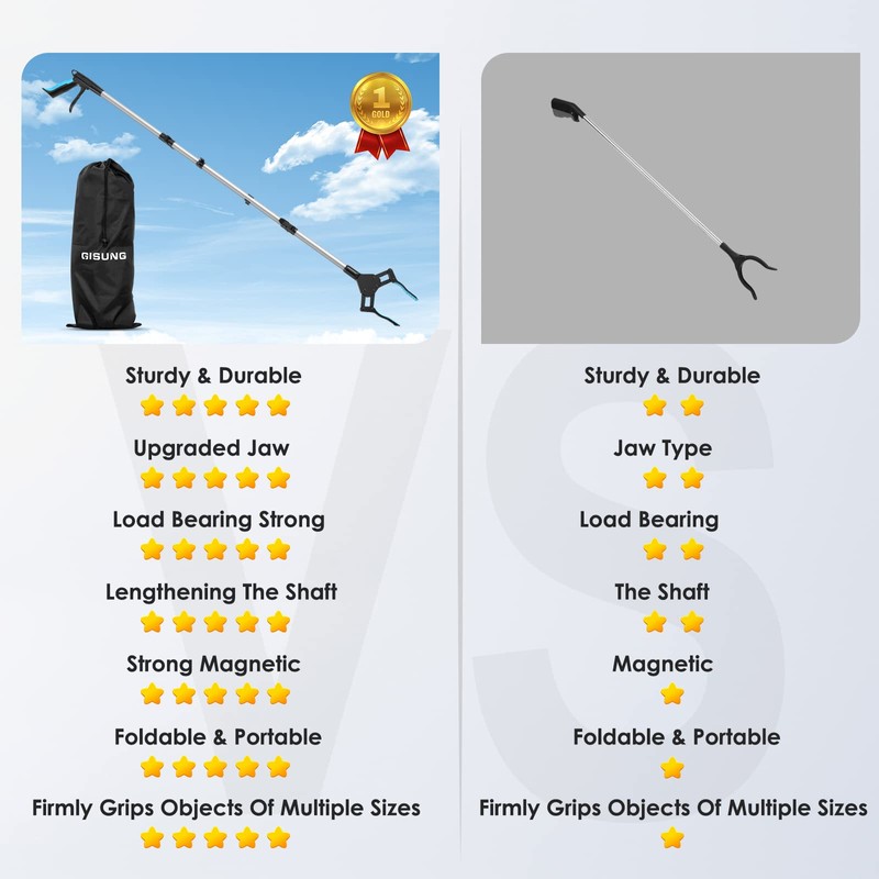 - [Sturdy & Strong] Do you long for a good grabber tool to help you when you have limited mobility? Gisung specially designed Grabber Reacher tool is made of thickened aluminum alloy & strong stainless cable to ensure it's sturdy & rustproof. We have a heavy duty PC material design in the latch of two parts connection, so they are sturdy & never broke at the joint. When giving your elderly loved ones a hand, there's nothing like having 44 inch grabber tool in their, well, reach.