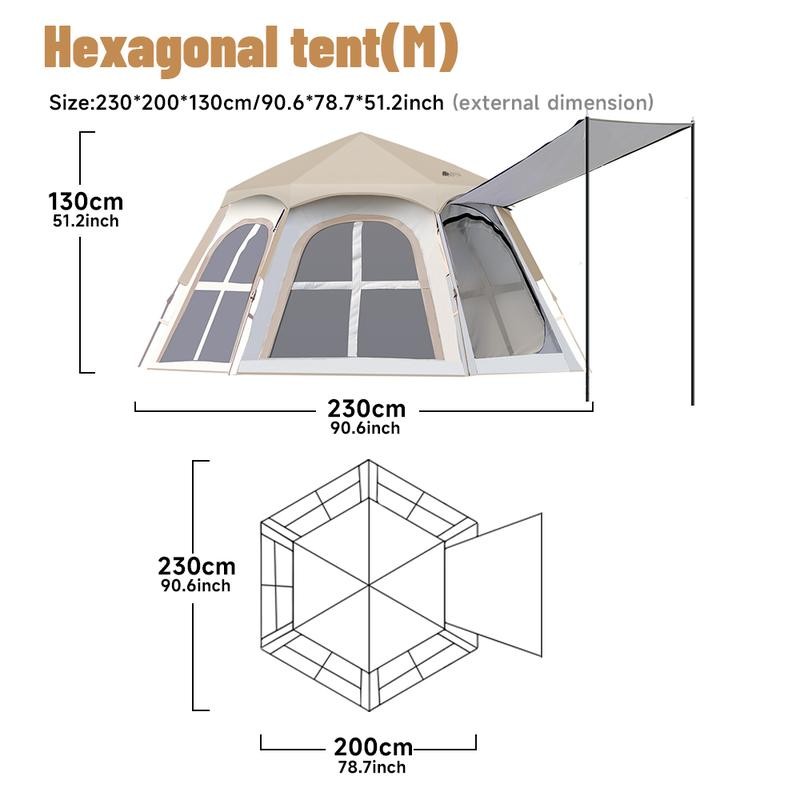 - [6-person Capacity]: The size of this camping tent is 90.6"Length x78.7"Width x 51.2"Height (230x200x130cm). The hexagon design offers ample space for family trip and sports activity with companions, comfortably accommodating 4-6 persons
