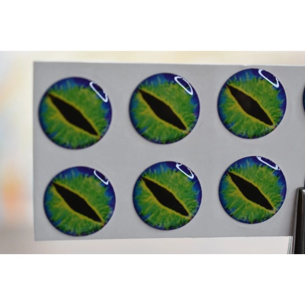 This is a lot of 10 realistic 3D soft molded domed eyes for fly tying, crafts, or lure making. Color is GREEN SLIT. NOTE: THERE IS GLARE FROM THE LIGHTING ON THESE EYES...THEY DO NOT HAVE THE WHITE LINES ON THEM. These have adhesive back (self sticking), and are .591" DIAMETER (15mm) in diameter. These are very cool, and I showed an up close picture for you to see what you are getting. These ARE NOT FLAT eyes. You can add a dot of glue for extra durability.