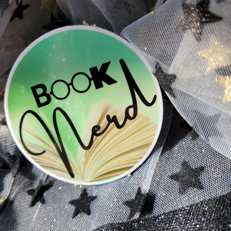 Circle Bookish Themed 3 inch by 3 inch Sticker, this gorgeous beauty has a green gradient with stars and a book backgroud with the words book nerd (book has glasses for the oo) perfect gift for your book minded friends!!