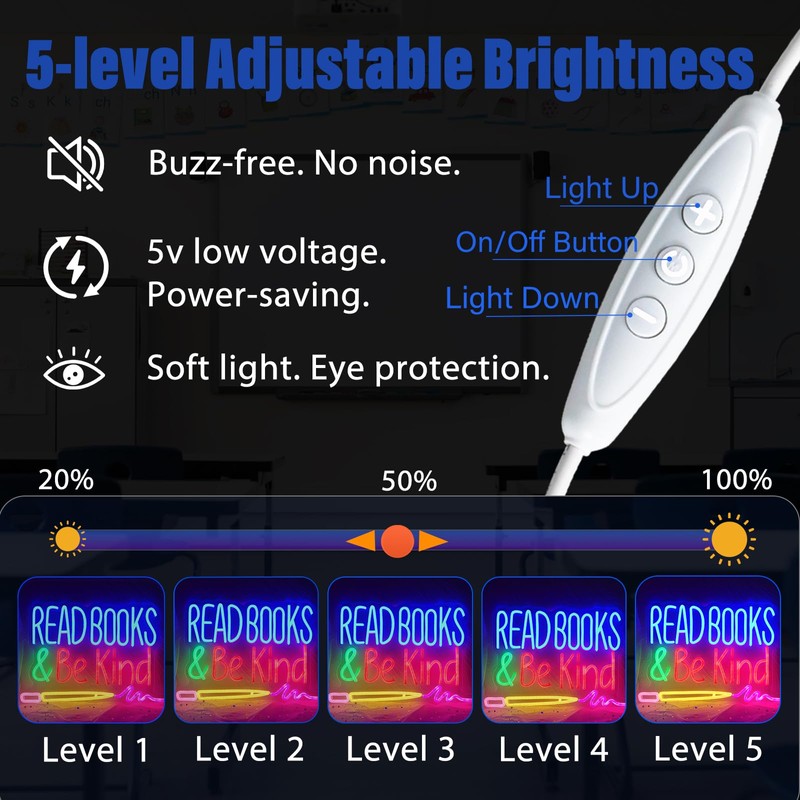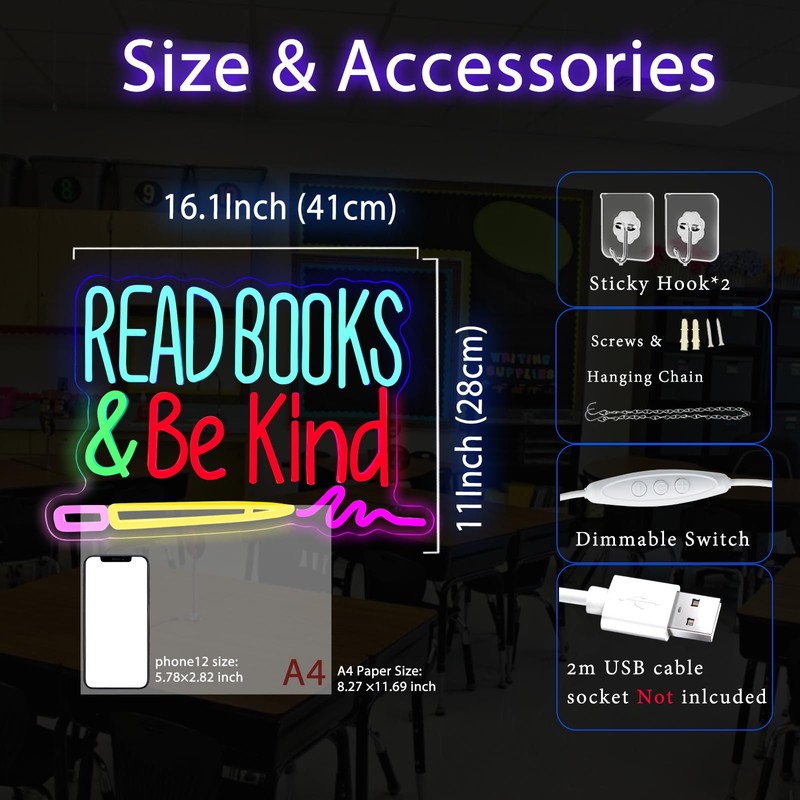 - Dimmable and USB Powered: The LED read books neon sign has a dimmer switch, can adjust 5 levels of bright (20% to 100%). USB plug makes this neon sign for classroom easily light up with a socket, power bank, computer, laptop and so on