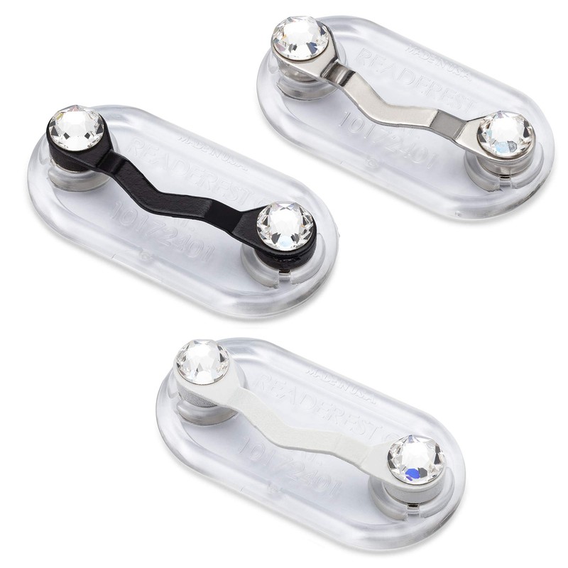 Readerest Magnetic Glasses Holders with Crystals for Women (3 Pack), Eyeglasses Clip for Readers & Sunglasses, Nurse Badge Holder, Made in America (Stainless Steel, Black & White)