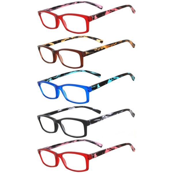 Readers 5 Pack of Elegant Colorful Womens Reading Glasses with Beautiful Patterns for Ladies Deluxe Spring or Fix Hinge for comfort Stylish Look when you need it. Best 5 pack of reading glasses for women at one low price. Designer Fashionable High Gloss reading glasses. Standard Sized Reading Glasses - Width: 5.4 Inches, Height: 1.4 Inches, Lens Width: 2 Inches, Arms: 5.5 Inches. 99% UVB and UVA protection from the sun. Item listed by Online- Welcome. Aren’t you tired of glasses that look cheap? Wearing these reading glasses at home, in bed, at the office, or wherever you need them, you’ll always look sharp, and see sharper! With our reading glasses you will have Ultimate comfort, important when you find yourself battling long days of reading. You will have 5 pairs of reading glasses. Put on in every room so you don't need to ever look for them. Take advantage of our 180 Day Zero-Risk, No Questions Asked 100% Money-Back Guarantee
