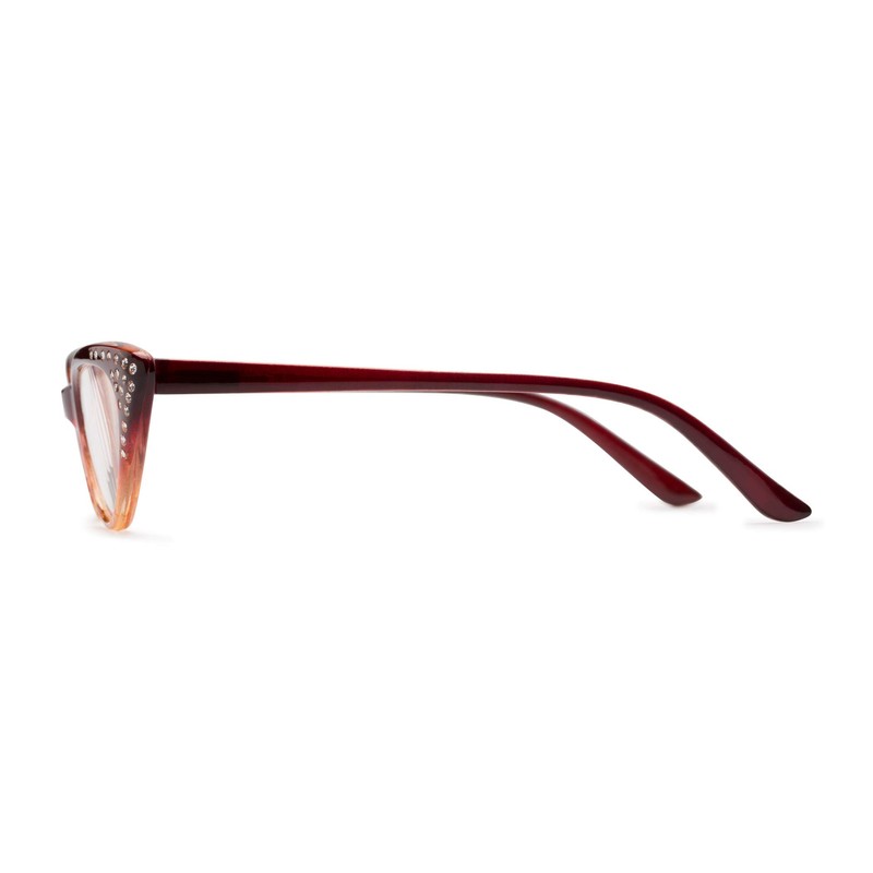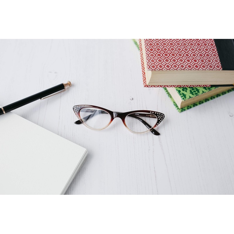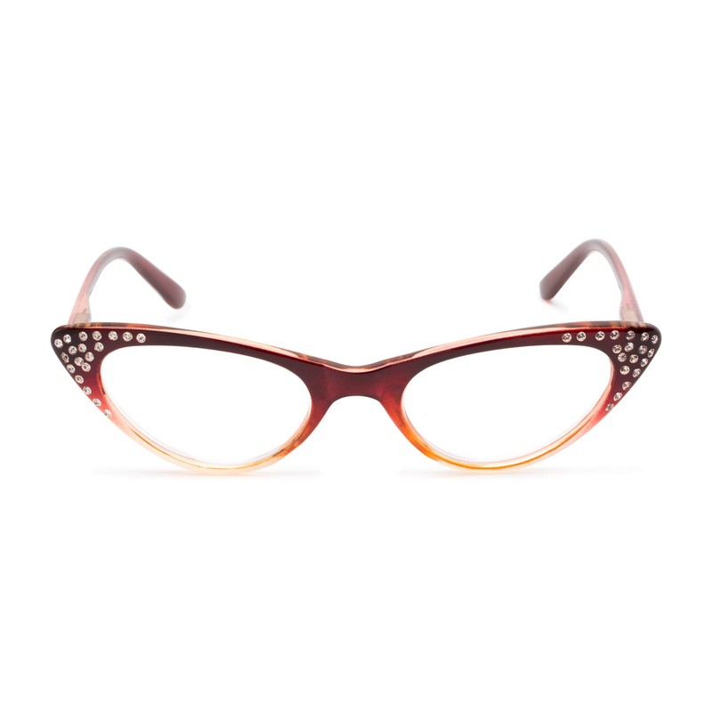 - THE PAULINA +2.75 BROWN/YELLOW FADE: All that sparkle on our Paulina reader will surely brighten your day! This full framed style has a lightweight cat eye frame sprinkled in rhinestones. Choose from a solid or color fade frame.