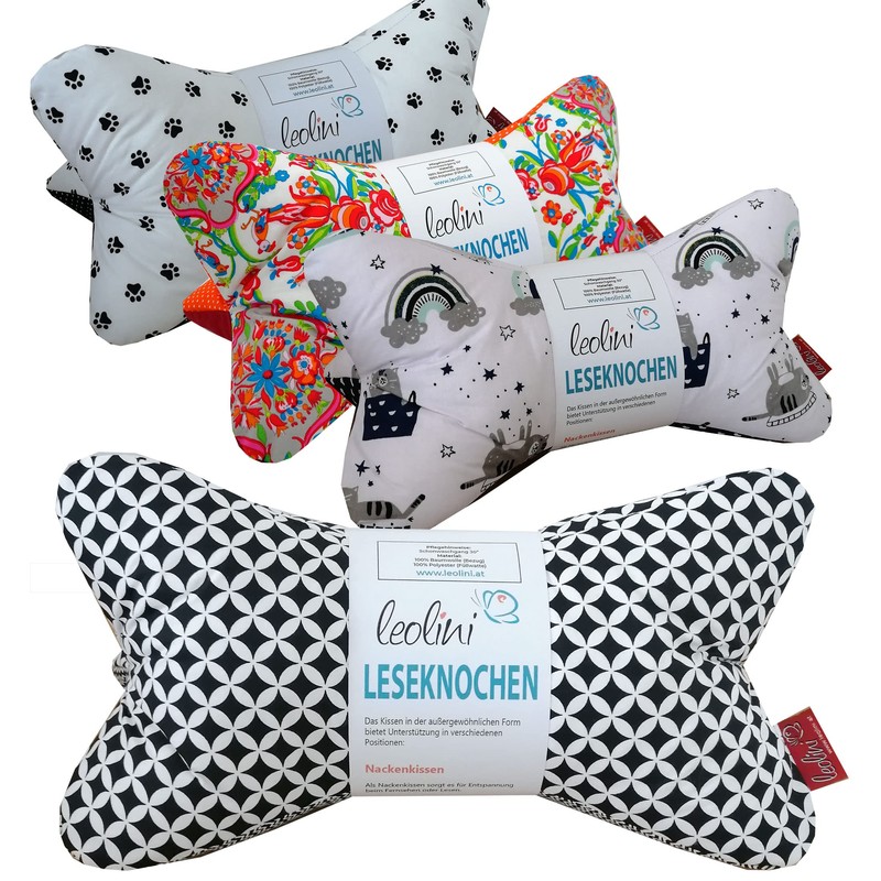 Information: This model can be ordered with or without embroidered names. In the option, please select whether the reading bone should be embroidered. Then simply indicate the desired name in the option (max. 12 characters). The name is in the colour according to Product photo embroidered on the cushion.