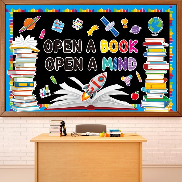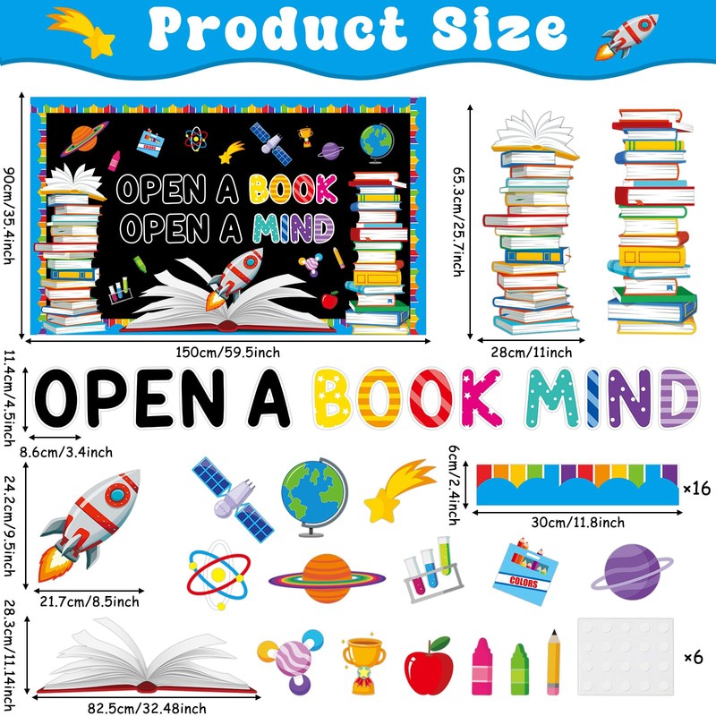 - Reading Bulletin Board Set: This set includes a title cutout that reads "OPEN A BOOK OPEN A MIND," an open book cutout, 2 stacks of books cutouts, 15 decorative cutouts featuring planets, a satellite, a globe, and more. It also comes with 16 border pieces and 6 sheets of adhesive dots. The variety and quantity provide everything needed to create an eye-catching display.