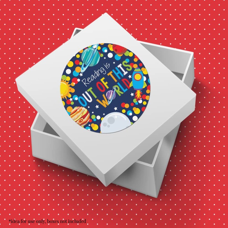 Reading is Out of This World Space Themed Reading Encouragement Sticker Labels, 40 2" Party Circle Stickers by AmandaCreation, Great for Teachers, Librarians & Students for Reading Rewards & Prizes