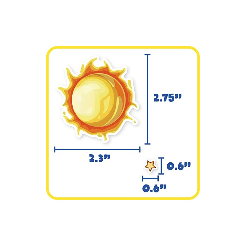Create outer space scenes and personalize your stuff with foam stickers! This sticker pack includes 4 foam sheets, each with 38 punch-out stickers in 17 different space-themed designs. These self-adhesive stickers easily push out of their foam sheets and peel for frustration-free craft time. These 3D stickers are durable, thick and easy to hold. Use these stickers to decorate DIY projects or personalize water bottles, computers, phones and more! Give these stickers as rewards after chores and homework. Or, as party favors and stocking stuffers. Kids will love to collect all the different space stickers! This set includes planets, stars, rockets and more! For ages 3+. || Size of Sun: 2.75"L x 2.3"W. || Size of small star: 0.6"L x 0.6"W.