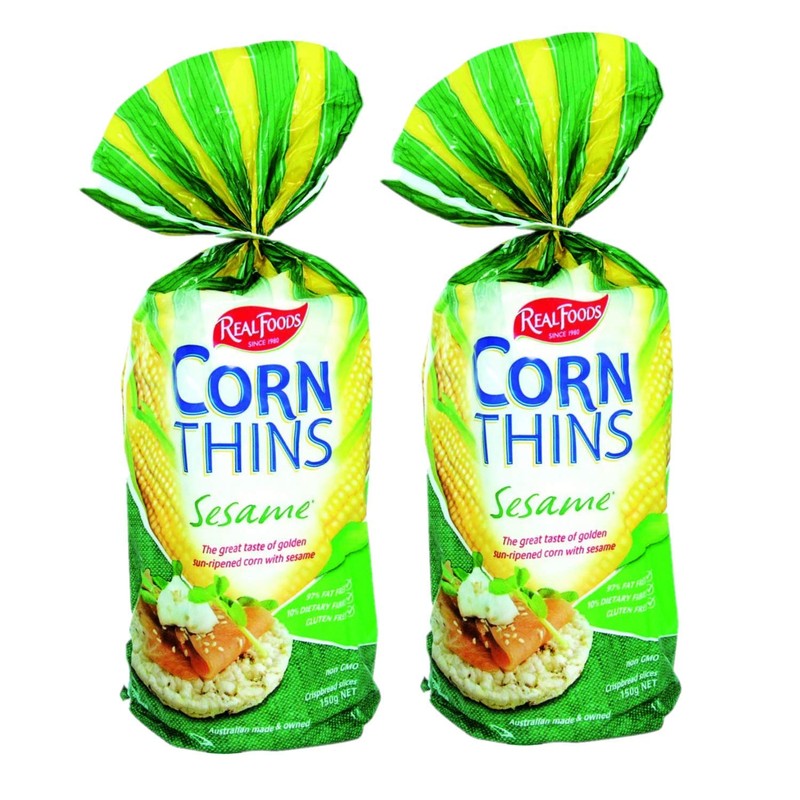 Real Foods Organic Sesame Corn Thins are a delicious alternative to rice cakes! Made with a great recipe for maximum crunch and flavor, they taste sensational on their own or with any number of delicious toppings. Our Original Corn Thins are made simply by popping grains of organic corn under high temperature. Being fat free and All natural, Real Foods Corn Thins are good for you. Real Foods is proud to be producing wholesome and natural products for people who enjoy great-tasting real food. Directions To maintain freshness, reseal pack after opening or store in an airtight container. Free Of Fat, GMO and gluten. Disclaimer These statements have not been evaluated by the FDA. These products are not intended to diagnose, treat, cure, or prevent any disease. Two 5.3oz packages.