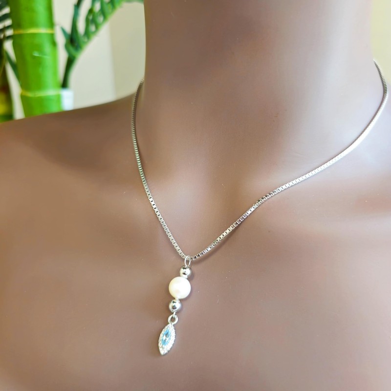 Real freshwater pearl and natural blue topaz pendant necklace 925 sterling silver chain jewelry by Uniquelan Jewelry (blue-topaz)