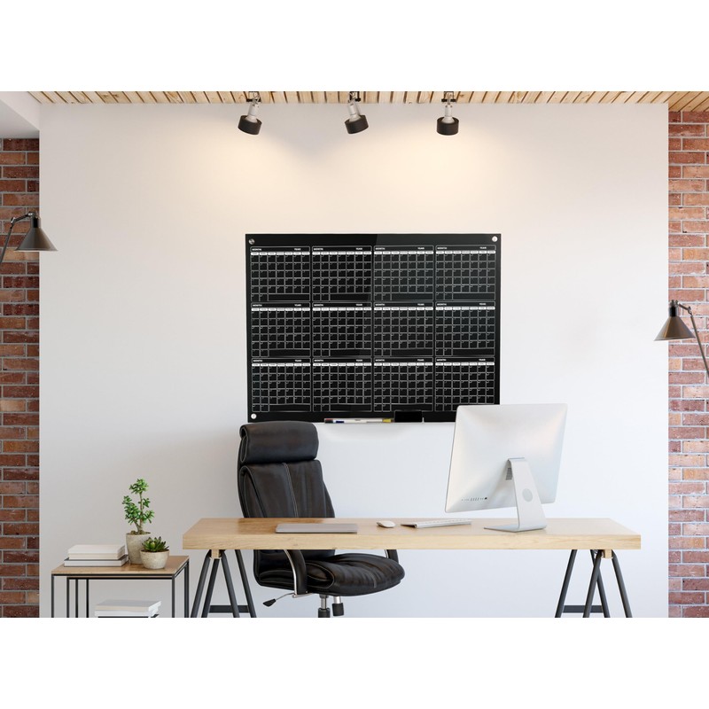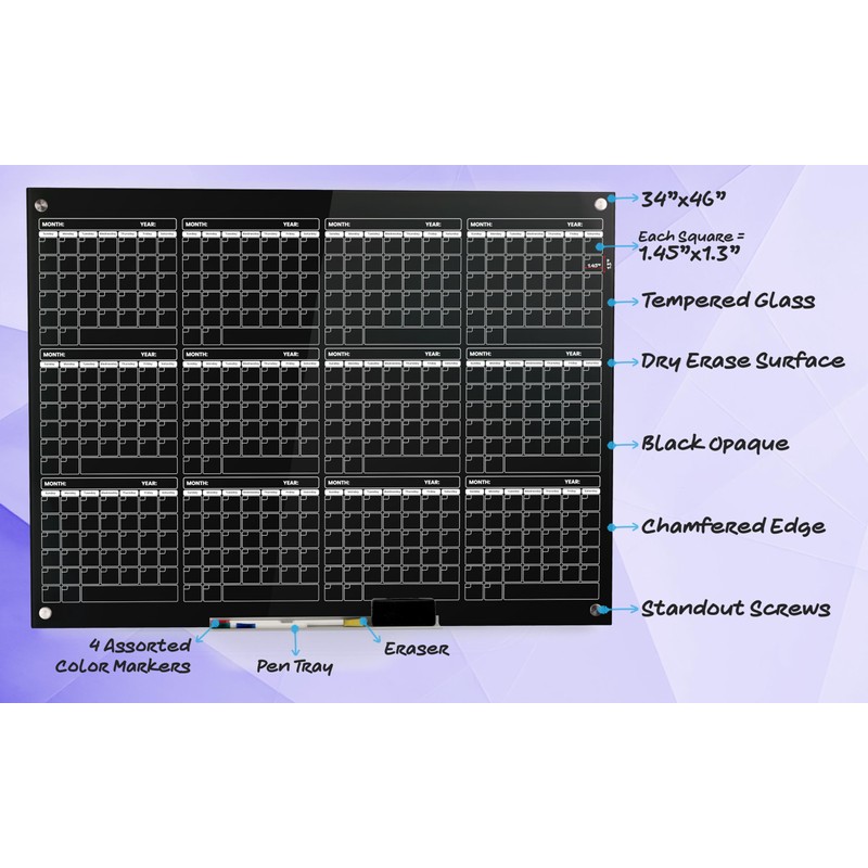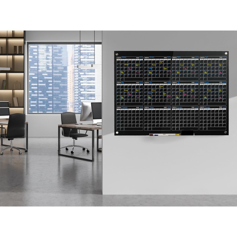 - YEARLY OVERVIEW: Plan your entire year at a glance with this spacious 34" x 46" glass dry erase calendar. The large surface allows you to map out important dates, milestones, and events, providing a comprehensive overview for effective long-term planning.