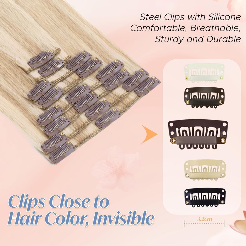 - 100% Remy human hair: Our real hair extensions clip is made of salon quality human hair, without synthetic fibres, which ensures that each strand of hair is naturally smooth, delicate and shiny and does not fall out. It blends perfectly with your own hair and supports perming and dyeing (it is recommended to dye light colours into dark colours, the temperature is ≤237°C), creating neat straight hair and fashionable curly hairstyles.