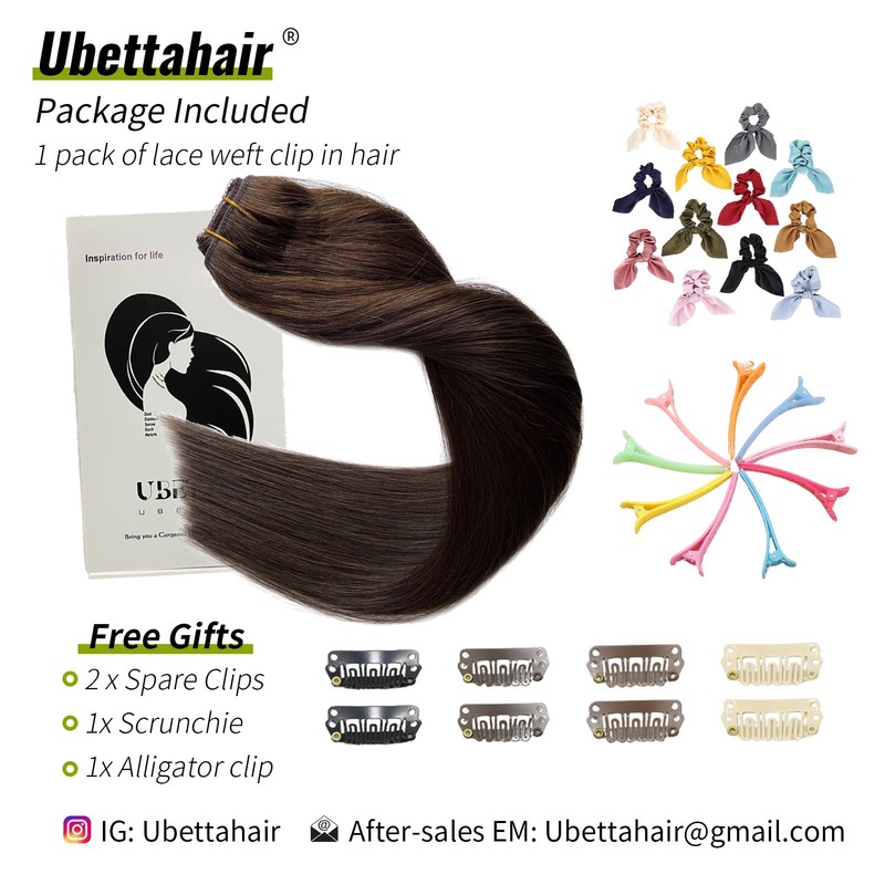 - 【Lace Weft Clip in Hair Extensions】-- Lace edge design make the hair extensions more comfortable and flat to wear. Clip in hair extensions is the easiest and convenient hair replacement unit for adding volume or length, to make your own hair fuller and more fashion and attractive. Ubetta human hair extensions clip on is easy to blend with your own hair naturally.