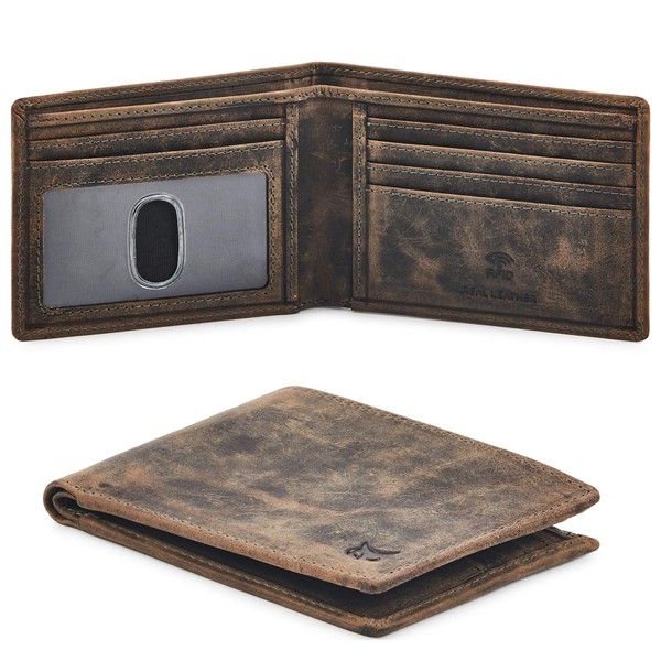 Real Leather Mens Bifold Wallet RFID Blocking Slim Minimalist Front Pocket - Thin & Stylish with ID Window (Moss Crazy Horse)