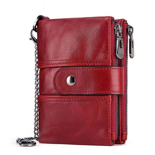 Real Leather RFID Blocking Bifold Wallets for Men Double Zipper Coin Pocket Purse with Anti-Theft Chain (002-Red)
