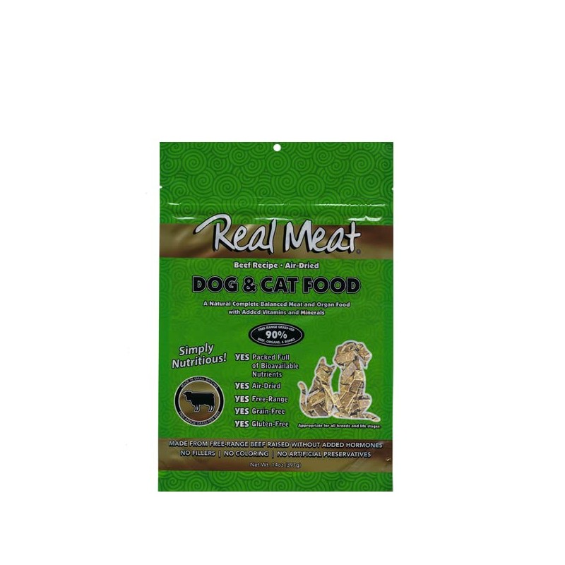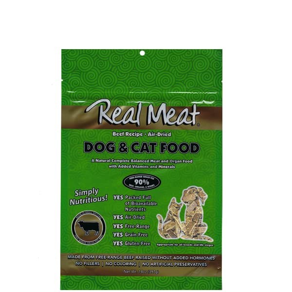 - Real Meat, the original air-dried dog & cat foods and natural limited ingredient jerky treats. Made from free-range grass-fed beef, lamb, venison, cage-free turkey or chicken and sustainably managed ocean-caught hoki and mackerel.