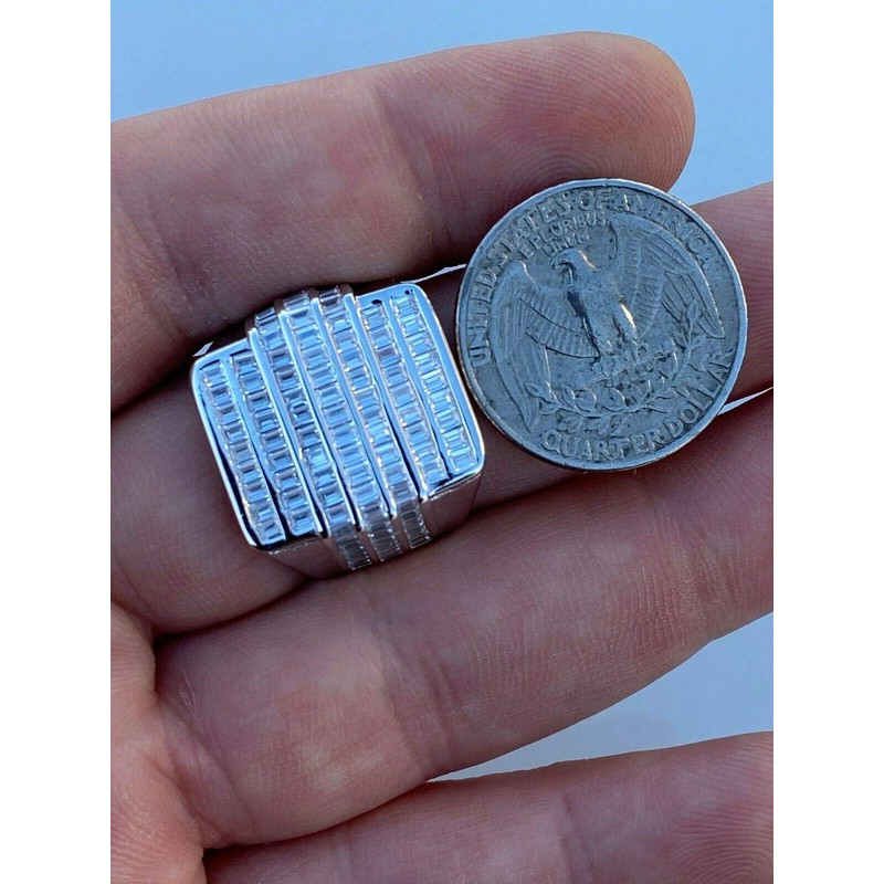 Real Solid 925 Sterling Silver Mens Large Hip Hop Ring - Fully Iced Flooded Out Ring W. Baguette Diamonds - Great On Pinky Or Ring Finger (9)