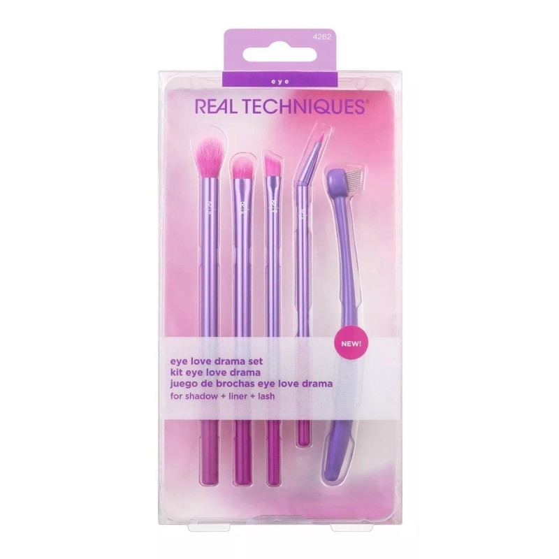 El kit de brochas de maquillaje Eye Love Drama de Real Techniques incluye (1) brocha para difuminar RT 320, (1) brocha para pliegues instapop RT 306, (1) brocha para delineador RT 344, (1) delineador ajustado RT 351 y (1) RT 352 cepillo definidor de pestañas