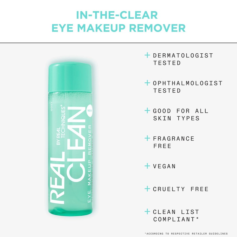 - The Real Techniques In-The-Clear Eye Makeup Remover removes stubborn eye makeup while keeping your skin feeling refreshed