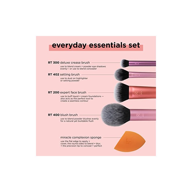 - Real Techniques Everyday Essentials Makeup Brush Set includes: (1) RT 400 Blush Brush, (1) RT 300 Deluxe Crease Brush, (1) RT 402 Setting Brush, (1) RT 200 Expert Face Brush, and (1) Miracle Complexion Sponges