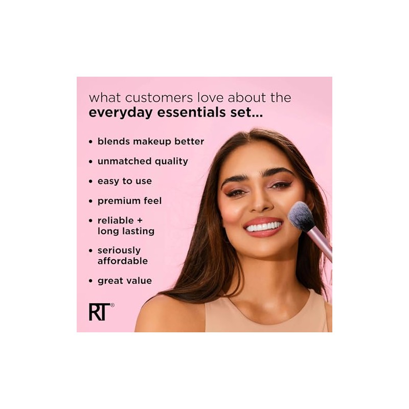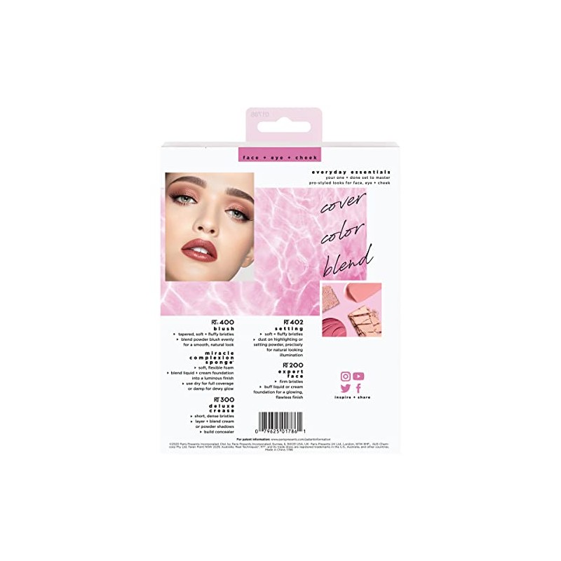 The Real Techniques Everyday Essentials Set is a one-and-done kit to elevate your makeup routine. This makeup brush kit comes with the brand’s fan favorite makeup tools: 400 Blush Brush, 300 Deluxe Crease Brush, 402 Setting Brush, 200 Expert Face Brush and our best-selling Miracle Complexion Sponge. These 5 makeup must-haves for your face, eyes, and cheeks include brushes with both fluffy and dense bristles, so they work with liquid, cream, and powder products. From foundation to eyeshadow- our makeup brush and sponge kit will help you achieve your best complete, pro-inspired look. Blend and bounce foundation with the makeup blending sponge, dust on powder with the large, fluffy brush, and smoke out eyeshadow with our crease brush. The Everyday Essentials brush kit is easy to clean using our Real Techniques Brush + Sponge Cleansing Gel. It’s also 100% cruelty and latex-free and made with soft, UltraPlush synthetic bristles. We are Real Techniques, the brand of choice for all makeup users, no matter your level of expertise. Created in collaboration with leading makeup artists, we aspire to take the mystery out of choosing beauty tools so you can focus more time on putting your best face forward one blend at a time. From full makeup looks, to quick beauty hacks, RT brushes + sponges are exceptionally high quality for professional looking results every time. BUT… don’t be fooled by our affordable prices, RT tools are award-winning + purposefully designed because that’s what you deserve. Quality without compromise.