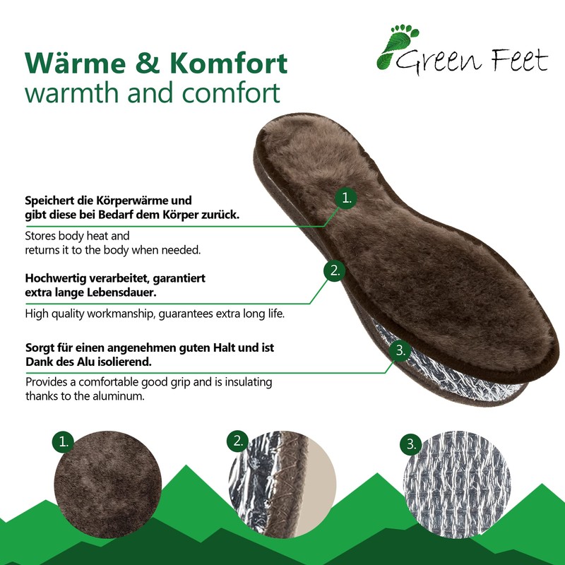 The cuddly warm GreenFeet lambskin insoles, made in Germany, made of dense lambskin keep your feet extra warm even in cold temperatures.