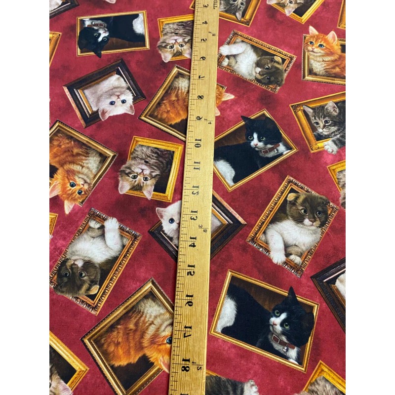 REALISTIC CATS IN PICTURE FRAMES RED BACKGROUND COTTON FABRIC FQ