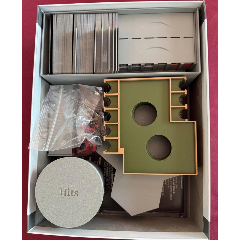 6 tank/commander organizers - They fit 91mm x 66mm sleeved cards snugly, counter spaces fit the 16mm square tokens (like damage, stress, etc. as well as a slot for vehicle commanders)